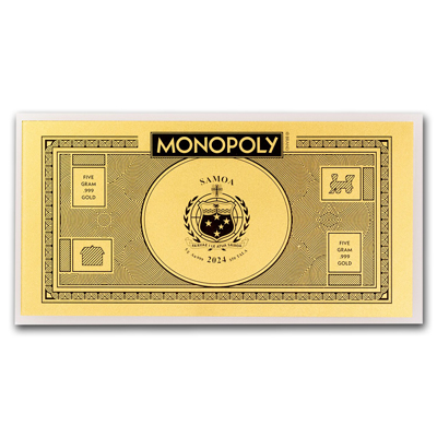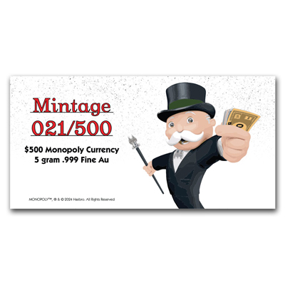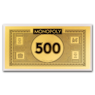 Transform your MonopolyTM game with the first-ever officially licensed Monopoly gold currency notes! These exquisite 5 gram gold notes are authentic replicas of the iconic Monopoly money, bringing a touch of luxury and prestige to the classic game of strategy and wealth-building.