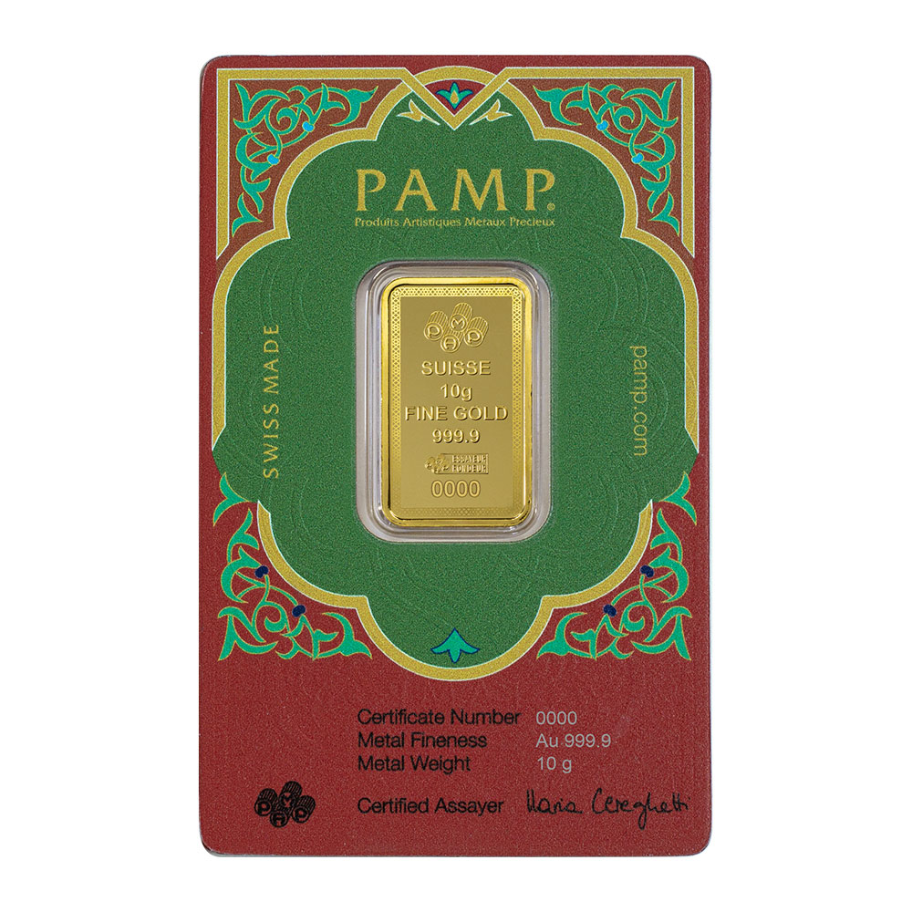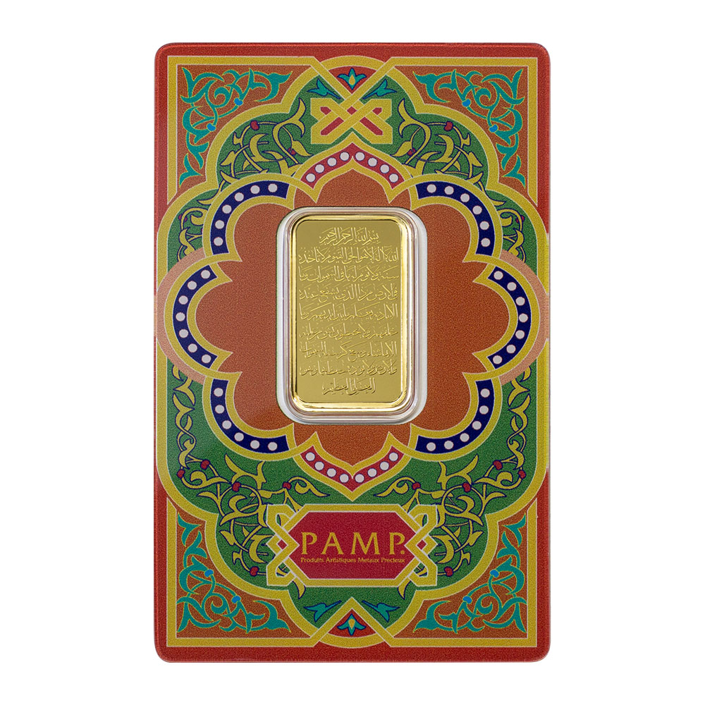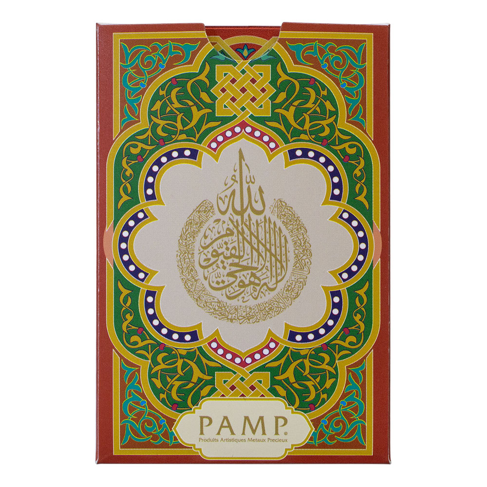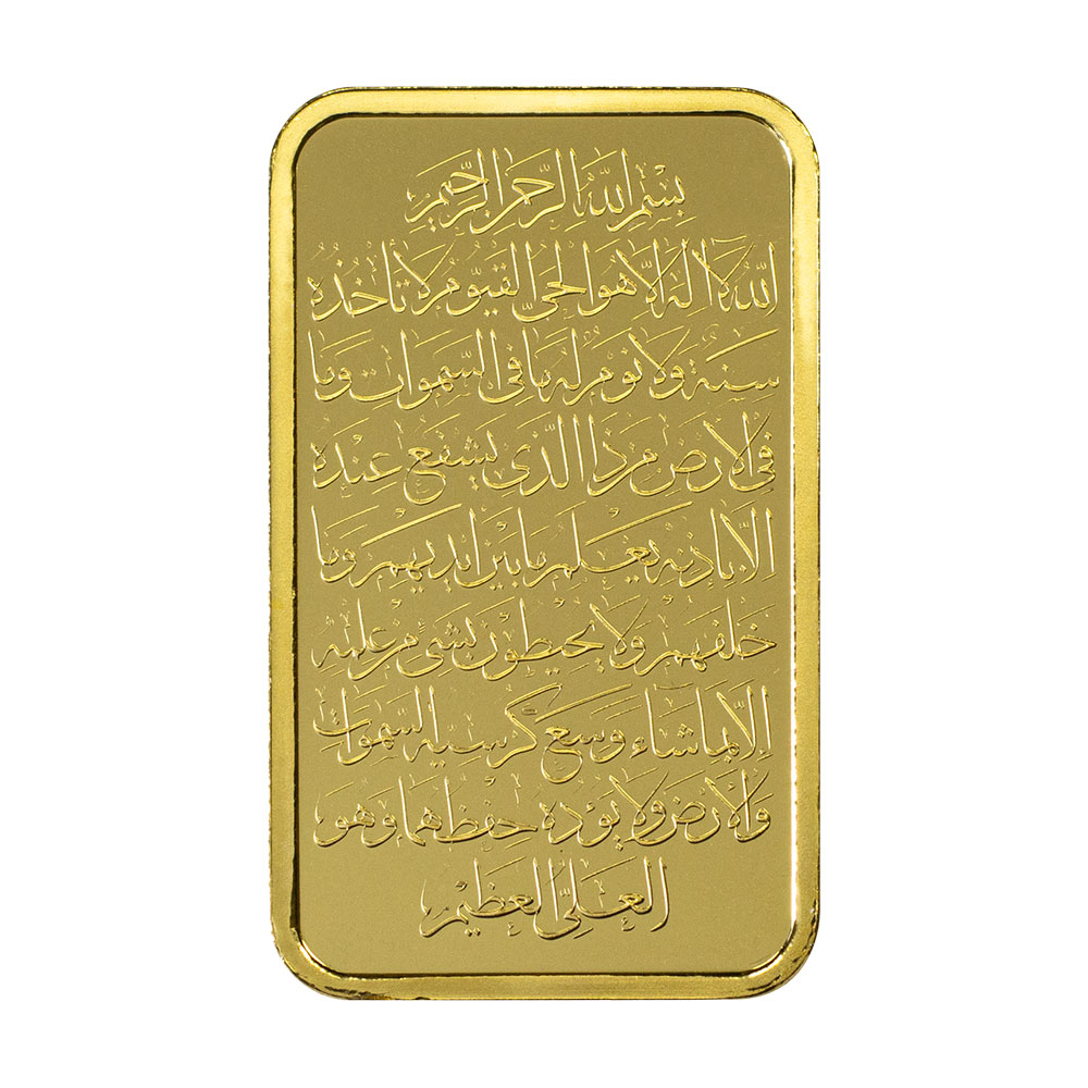 Introducing the 10 Gram Pamp Suisse Ayatul Kursi Gold Bar. This exquisite piece of gold carries the revered Ayatul Kursi verse from the Quran, making it a cherished possession for any believer.