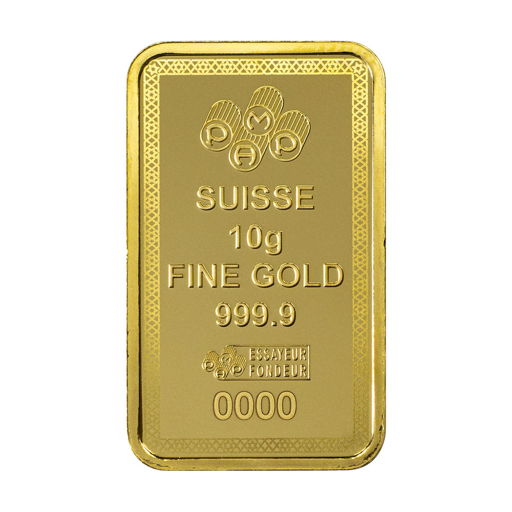 The obverse side of the bar features essential identifying marks, including the PAMP logo, metal content, purity, an assayer's mark, and a unique serial number.